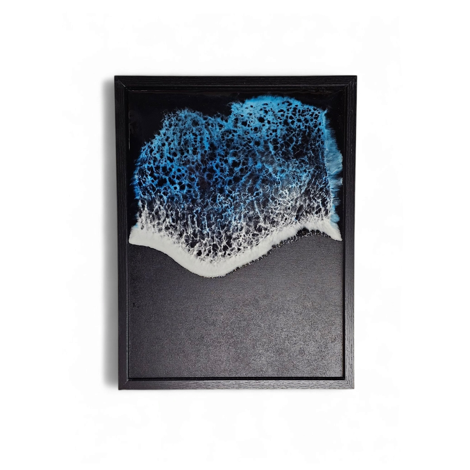 Apportez une touche d’élégance et de sérénité à votre intérieur avec ce petit tableau artisanal en bois noir sublimé par une résine aux nuances océaniques profondes. Chaque pièce est soigneusement réalisée à la main, offrant un effet d’eau et d’écume qui évoque la puissance et la beauté des vagues.